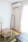 | 室内 | エアコン・カーテン・ベッド・布団一式(レンタル有料) ・クローゼット・机・鍵付・ベランダ付(1階は庭付) |